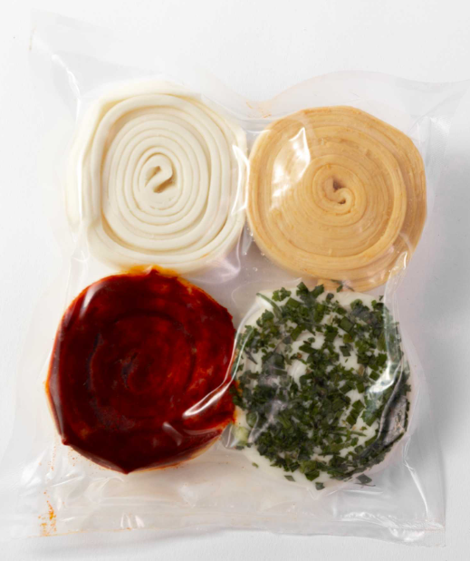 Zloženie: mliekarenský hrudkový syr, oxid siričitý, jedlá soľ, pitná voda, cesnak granulovaný sušený, medvedí cesnak, pažítka sušená, petržlenová vňať, paprika sladká mletá a štipľavá mletá.